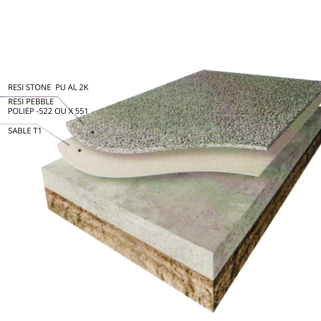 polyurethanes non jaunissantes,avec les RESI PEBBLES (pierres naturelles lavees et sechees,granulometrie 2-4 mm) dans un ratio de 5 % de liant par rapport au poids des granulats.